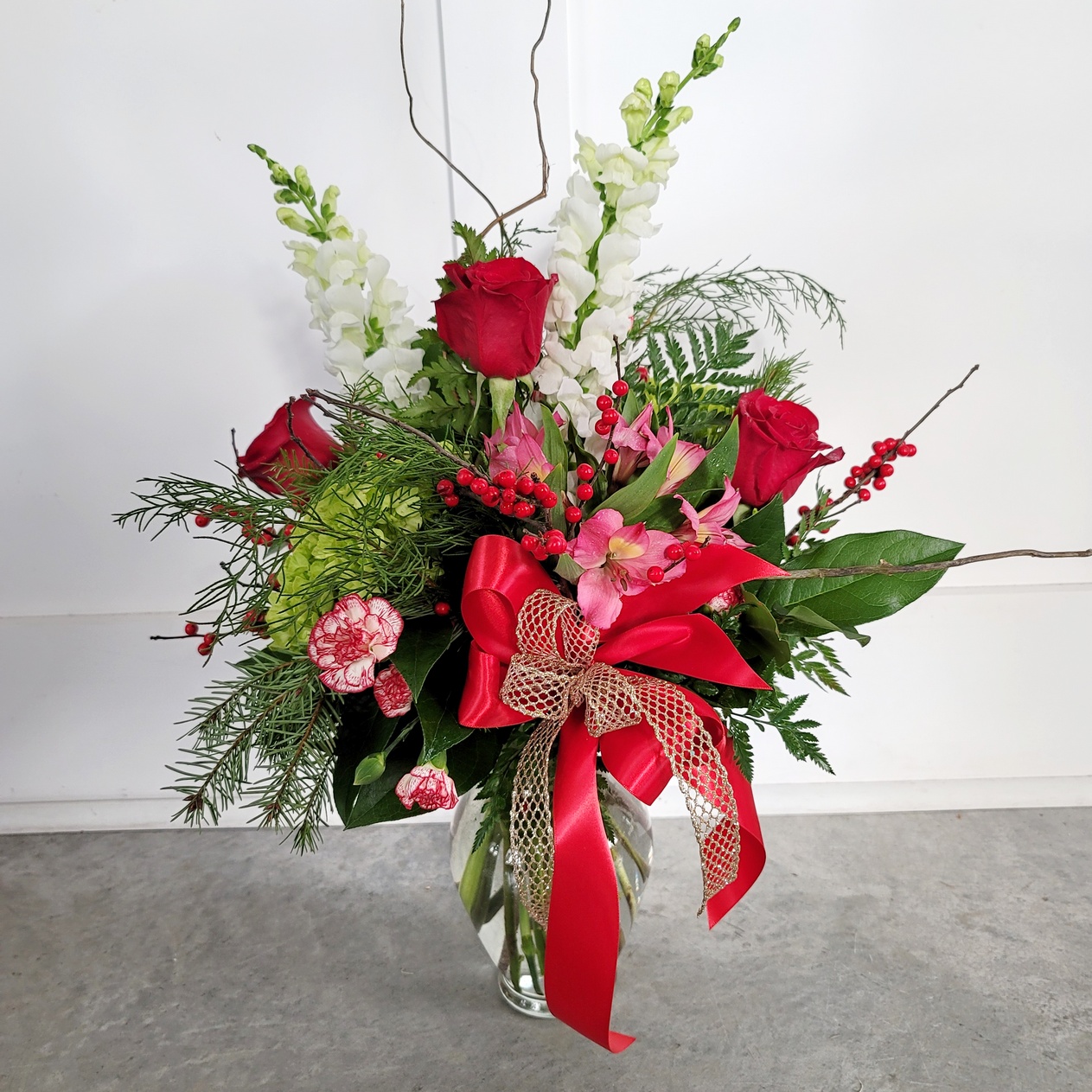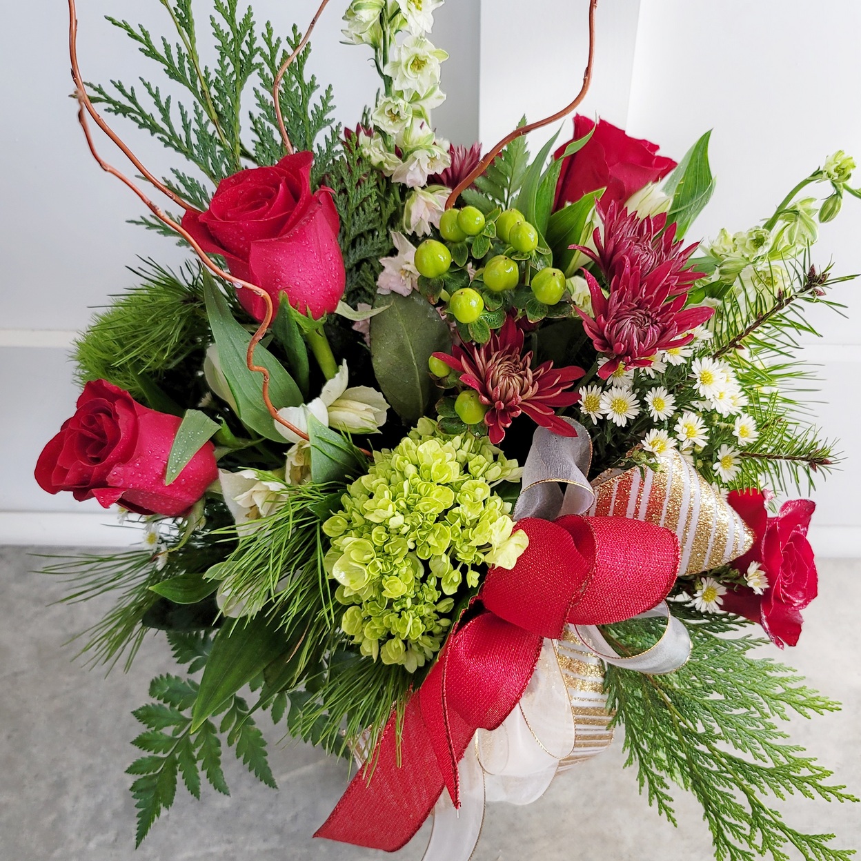 Fresh floral arrangement of designer’s choice seasonal flowers in glass vase. Currently winter arrangements will include a mixture of blooms amidst a bed of mixed foliage, evergreens and textured fillers. If you have specific color or flower preferences, please indicate below in the section “Notes for Florist”.